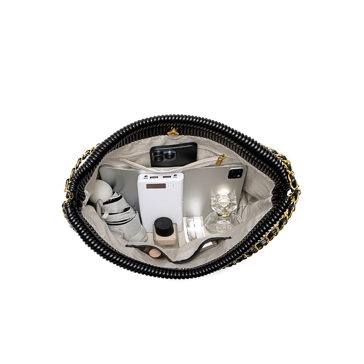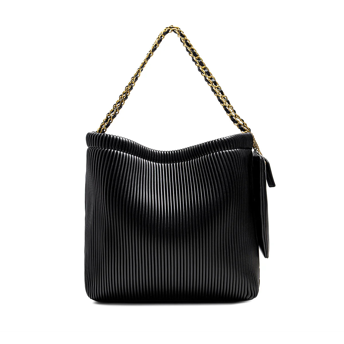 The Isabella Shoulder Bag combines luxury and practicality with its elegant chain design and soft pleated vegan leather. Thoughtfully designed with a removable pouch, it ensures you stay organized while on the go.