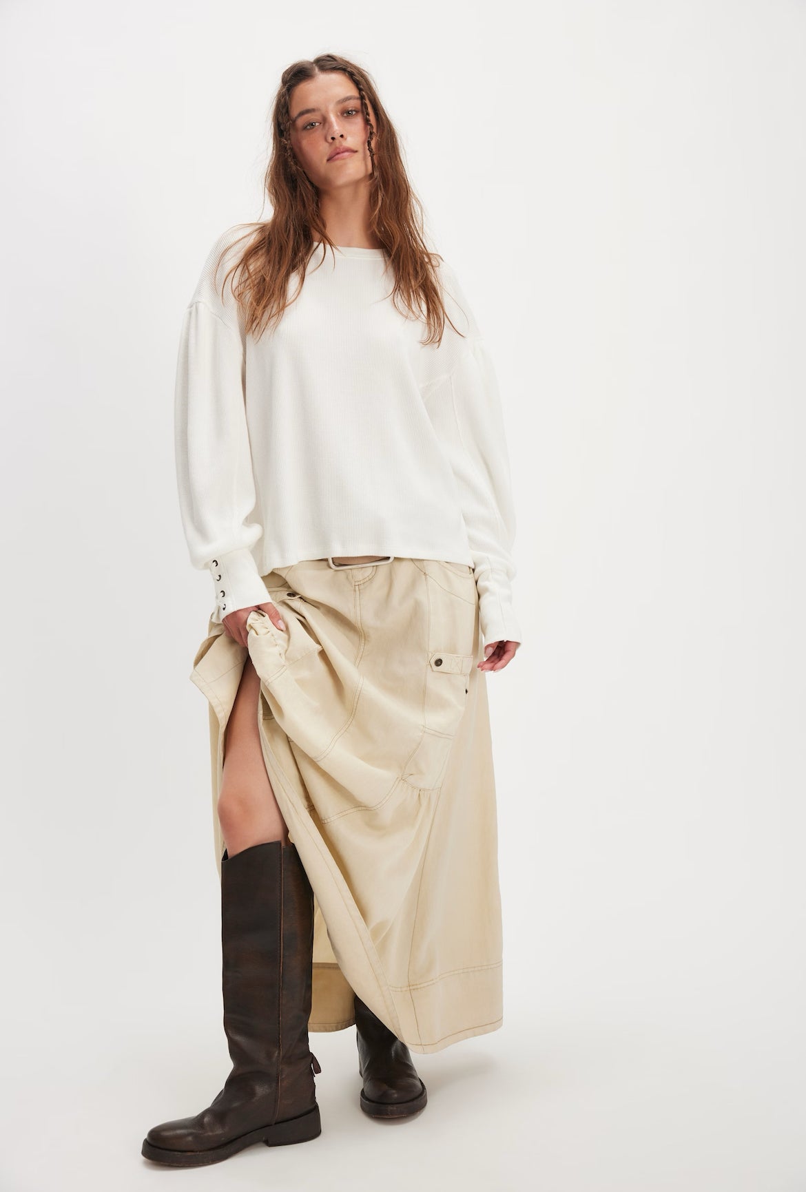 Lace-up details adorn the cuffs of this laidback long sleeve from We The Free, featured in a classic thermal fabrication with voluminous sleeves for added dimension.