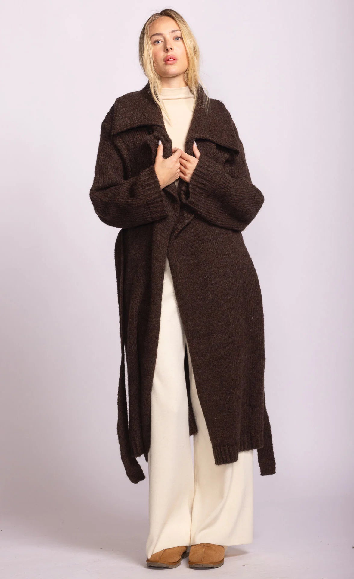 The Martha sweater is a robe style sweater complete with a waist belt. Oversized, wide sleeve and the perfect cozy ayer to throw on overtop.