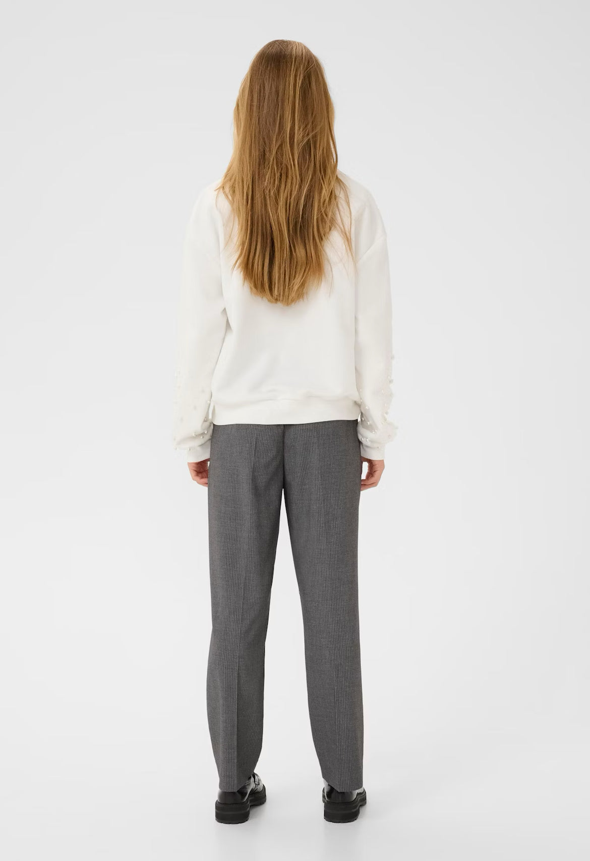 This sweatshirt has a straight cut and a soft finish. Beaded details on the sleeves give a clean look with a subtle edge and casual elegance.