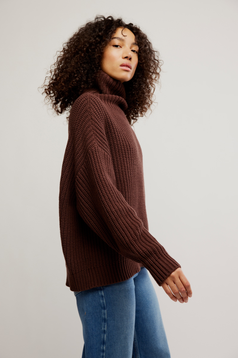 Turtleneck design, oversized fit, unlined construction, cozy knit texture, easy layering piece