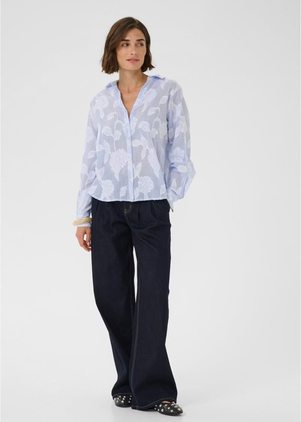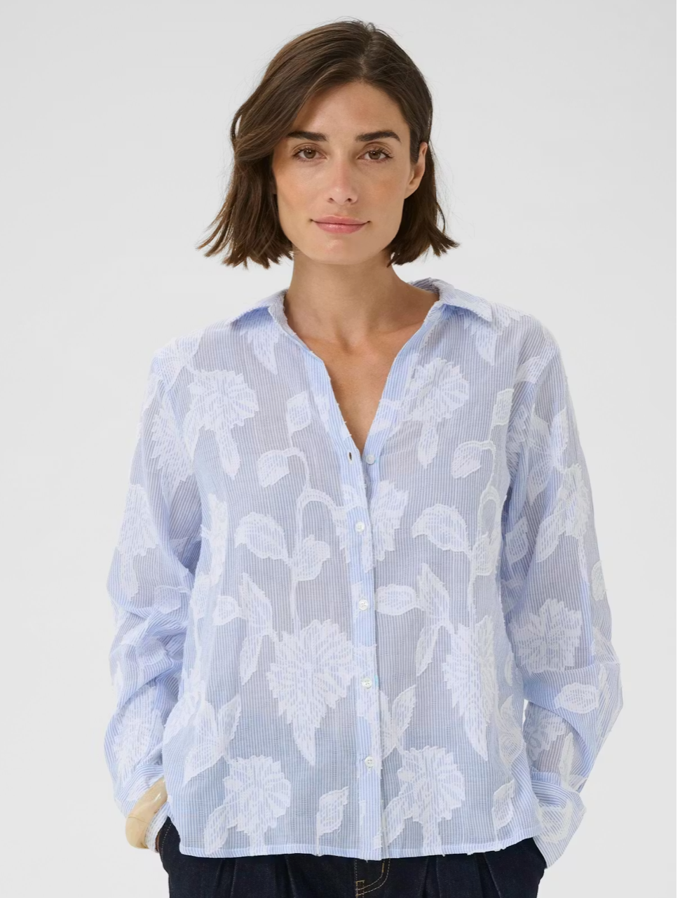 Button-up shirt with a straight, loose fit and classic collar. Features long sleeves and a slightly sheer, lightweight appearance with a rounded hem.